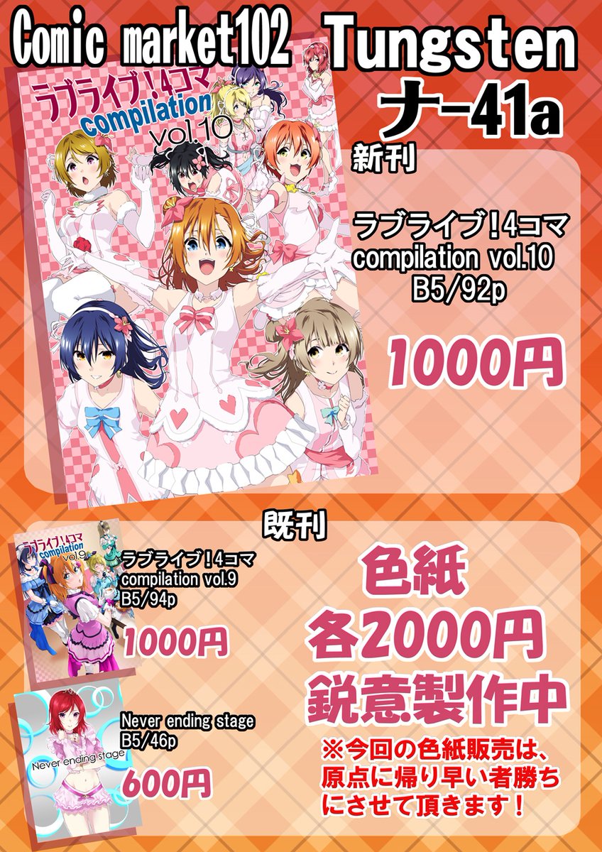 81 469 【c102新刊】 ラブライブ!4コマcompilation vol.10 日曜日 東6 ナ-41a 当日はよろしくお願いします! 23/08/05 21:18