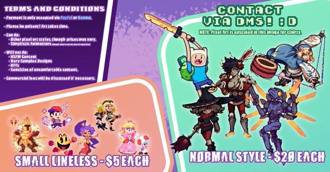 I'm openin' comms for Twitter now! I'm in a tough situation in my personal life rn so I'm tryin' to make some extra money! Retwts are rly appreciated! Tysm! Repostin' cuz I forgot to put hashtags last time whoopsie ---- #pixelart | #ドット絵 | #opencommissions #commissions