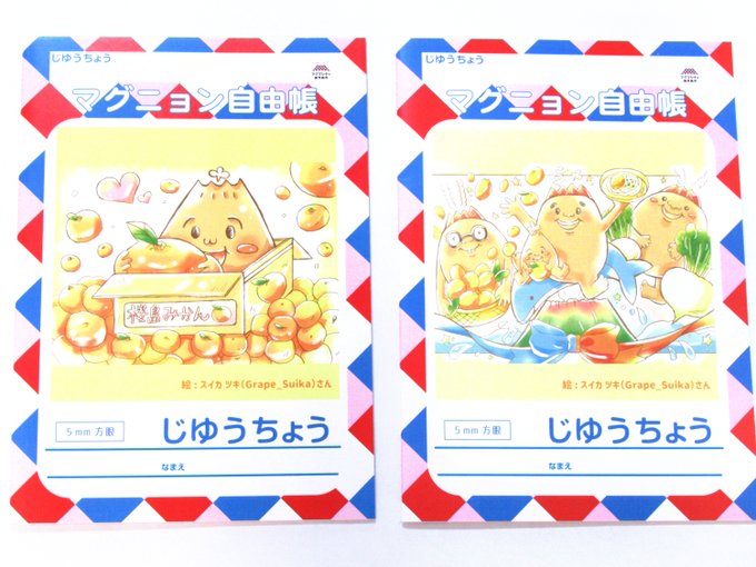 #イラスト 「#お絵かきマグニョン」コンテスト入賞作品をノートにして頂きました!最終選考作品のも頂いてとても嬉しいです。頂いた屋久杉は木の良い匂いで、可愛いマグニョンのマグネットもみんな大切に使わせていただきます。ありがとうございました。