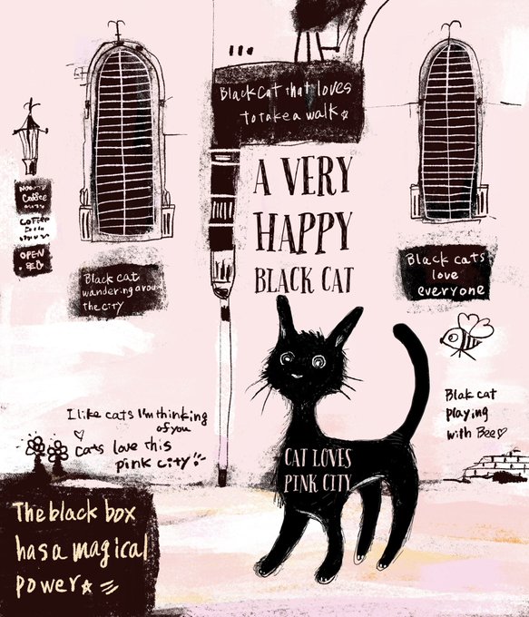 とても幸せな猫 ピンクの街をミツバチとブラブラする猫 ブラックボックス #illustraion #drawing #illustraionart #graphicart #picturebook #artwork #childrenbook #catlover #猫好き #CatsOfTwitter #絵本 #猫好き