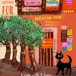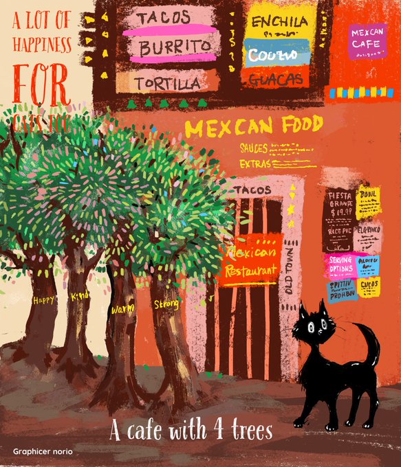 赤いメキシカンショップの庭に4本の木を描きました。ハデハデなカラーですが、 スタミナカラーということで、今日も元気に頑張りましょう。 #illustration #drawing #illustrationart #picturebook #ChildrensBooks #artwork #catlover #graphicart #artdirector #絵本