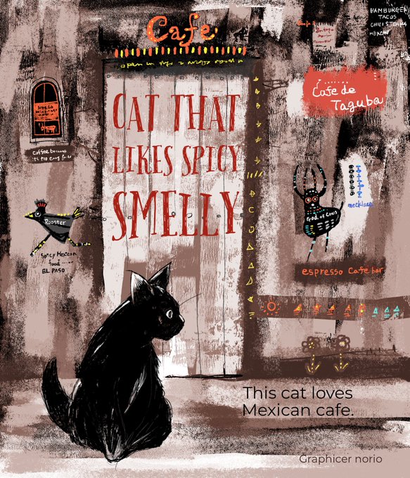 スパイシーな匂いが好きな猫 メキシカンカフェが落ち着く猫 古いカフェ 木造塗り壁のカフェ #illustration #illustrationart #drawing #graphicart #picturebook #artwork #childrenbook #cat #catlover #絵本 #猫好き