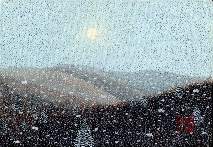 R4 #絵筆と旅して展 から、暑い真夏に冬景色のご紹介😅 北海道の早春、雪の空地に教会へと続く足跡が😲 ついつい気になって雪なのに😝黒1本で描いた作品🖋️ #ボールペン画 #イラスト #絵 #art #三菱ジェットストリーム #江別 #日本キリスト教団江別教会