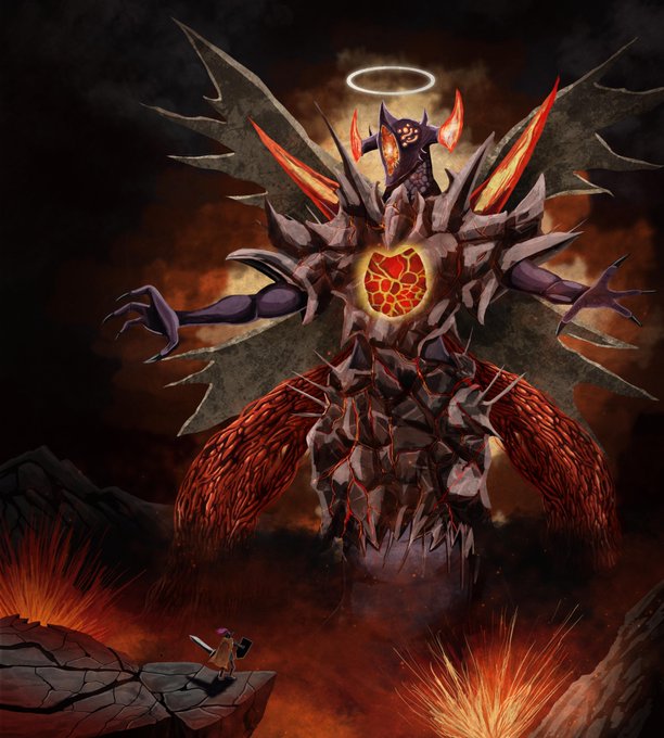 4 18 火の守護者 #イラスト #ガオクリーチャー 火炎の魔力球が内蔵している炎のゴーレム。 二刀の炎剣は対象の身を焦がすまで降り続ける。 23/06/13 23:19