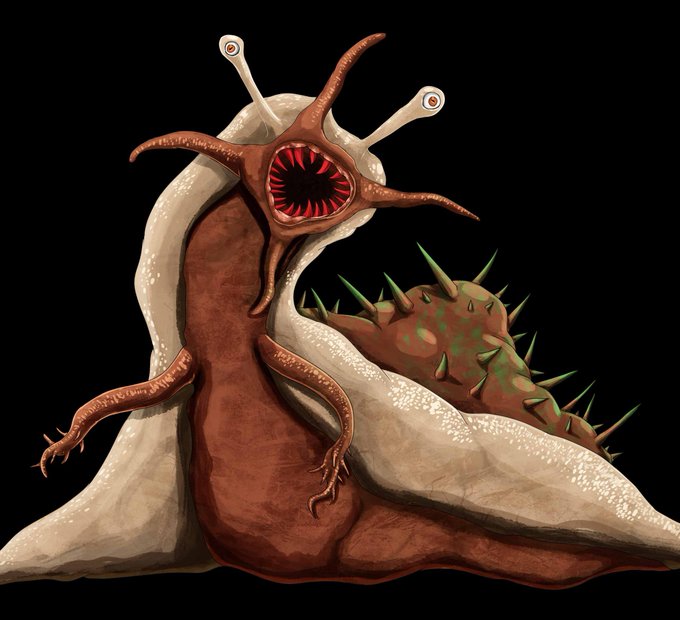 4 9 ヘルスネイル #イラスト #ガオクリーチャー 沼地や洞窟に出現する大型のナメクジ。 店売りの剣では刃が通らない程の肉質を持つ。 炎か大量の塩が必要だ。 23/04/28 18:17
