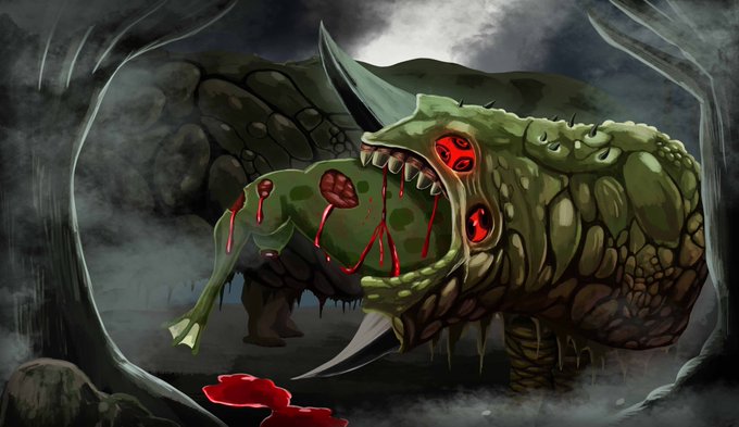 ヘルスネイル #イラスト #ガオクリーチャー 沼地や洞窟に出現する大型のナメクジ。 店売りの剣では刃が通らない程の肉質を持つ。 炎か大量の塩が必要だ。