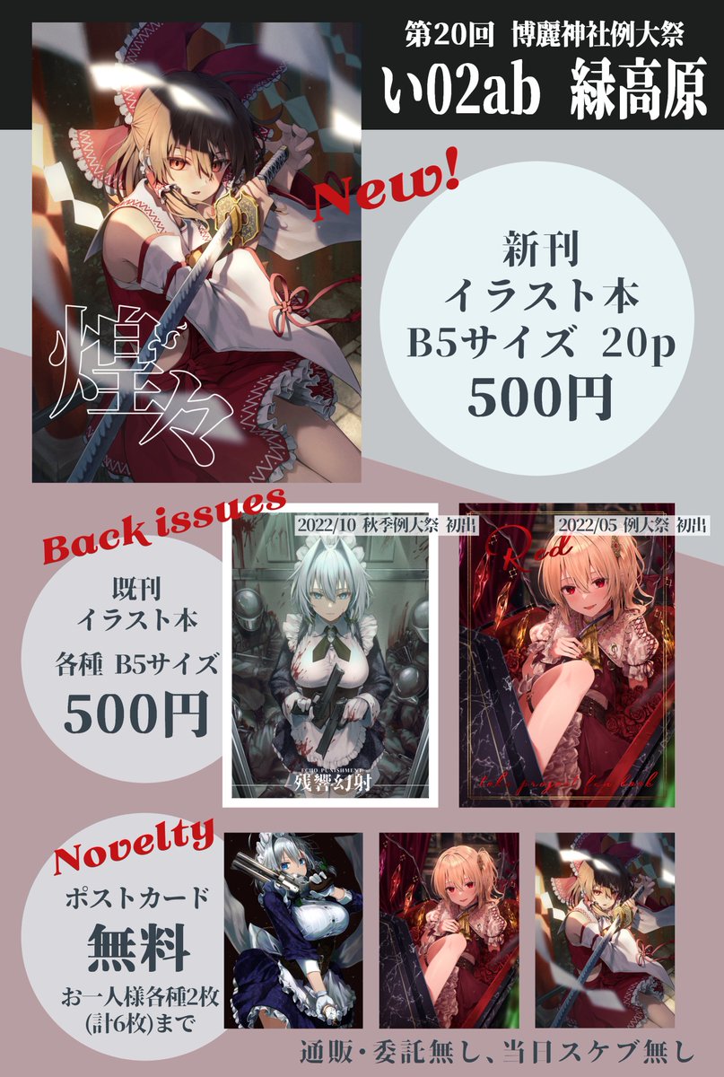 100 217 【🥳例大祭お品書き🥳】 5/7開催の博麗神社例大祭のお品書きとなります!今回は新刊既刊の他にもポストカードやポスター抽選会もあります!ご興味ある方は「い02ab」まで是非~~✨✨ 23/05/03 19:56