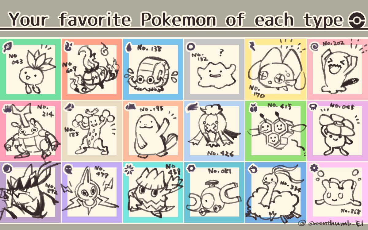 Your favorite Pokemon of each type 絵描きなんだからジェネレーター使わずに描こうな! という心の声が聞こえたので描きました 選ぶのに悩むタイプと表見て決めたタイプとの落差が凄い(草ゴースト水氷とかは競合率高い)
