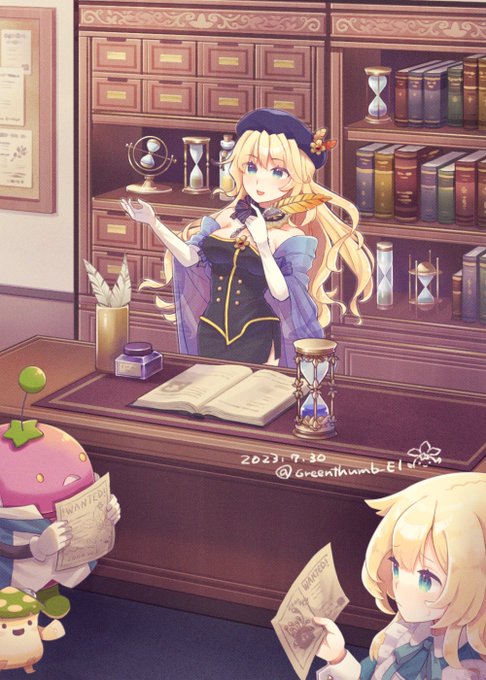 19 49 Skebで描かせて頂きました! 冒険者ギルドと受付のお姉さんと砂時計コレクション…と張り紙を見て悩む冒険者 23/07/30 21:16
