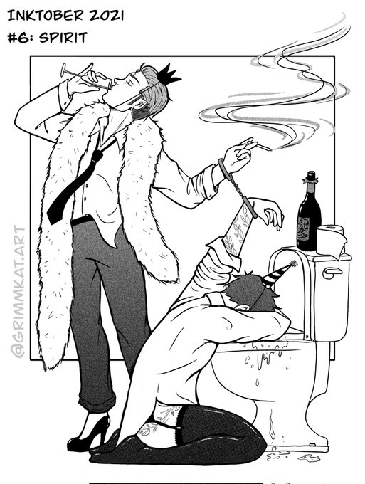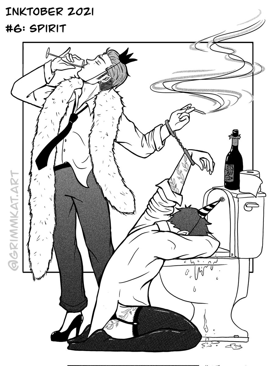 #inktober2021 day 6: Spirit Oliver can't handle vodka. Anthony is a classy bitch. Work hard, play harder. That's the spirit. #inktober #ipevo #inktoberday6 #inktoberspirit #procreate #procreateart #digitalinktober #blackandwhite #screentone #lineart #lineartwork