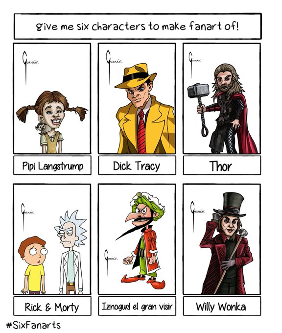 Pues yo también me he unido al reto de los seis fanarts de @mcapriglioneart He ilustrado a: Pipicalzaslargas, Dick Tracy, Thor, Rick & Morty, Iznogud el gran visir y Willy Wonka. #sixfanarts #Challenge #Guzmán #arte #reto #retocomic #fanart #art #draw #Pipicalzaslargas #Dick