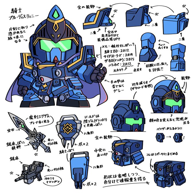 外伝キャラから学ぶ、スダ・ドアカワールドデザインの作り方(騎士ブルーディスティニー編)!!今回は騎士化のお手本のようなデザインで、モチーフ解釈の基礎が沢山詰まっているように感じました キーワードは「形状は省略しつつ、色分けで情報量を得る」 #SDガンダム #ジークジオン