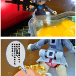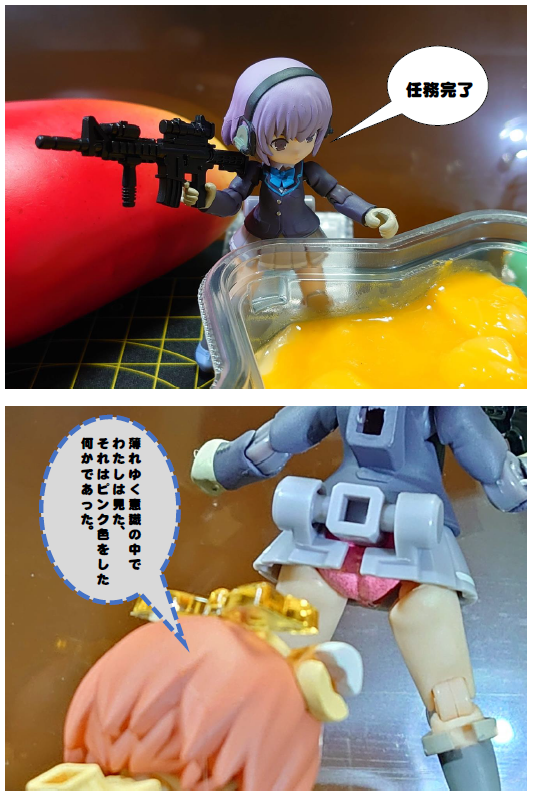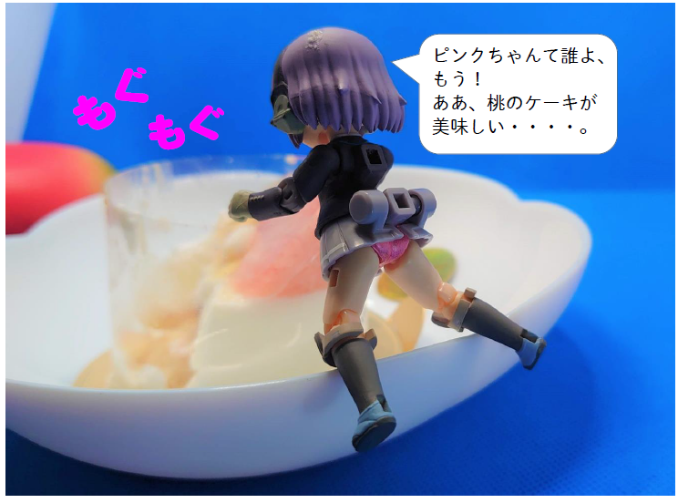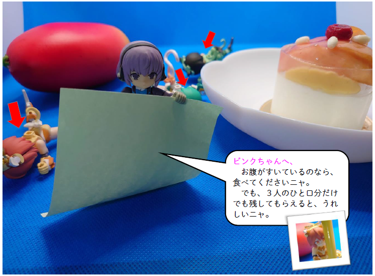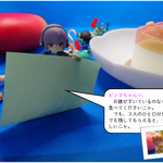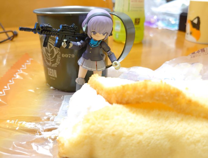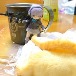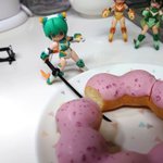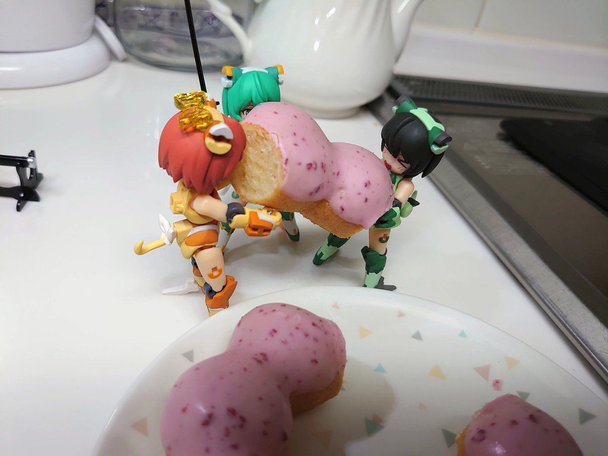 1, パパがドーナツ買ってきたニャー シロちゃん、早く切ってー! 2, とー! やー! 3, たー! 凄ー! 4, 早く、気が付かれないうちに持ってくニャー! #デスクトップアーミー #羽村市 #ドーナツ