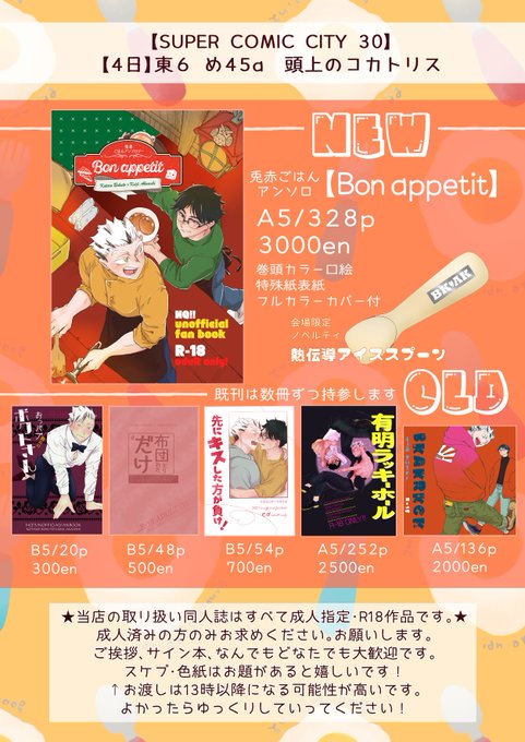 31 93 兎赤の本を頒布します! 5月4日スパコミお品書きです~当日はよろしくお願いいたします❣️ 23/04/29 06:09