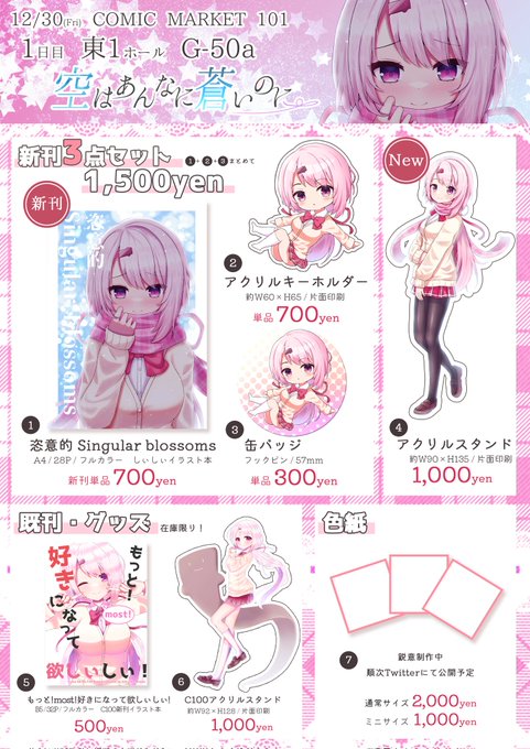 コミックマーケット101おしながきです!うごくおしながきもあるのでそちらも見ていただけると嬉しいです! しぃしぃイラスト本やアクキー、アクリルスタンドなどのグッズを頒布します! 12/30(金) 東1ホール G50-a 『空はあんなに蒼いのに。』 宜しくお願いします! #C101 #C101お品書き twitter.com/i/web/status/1…