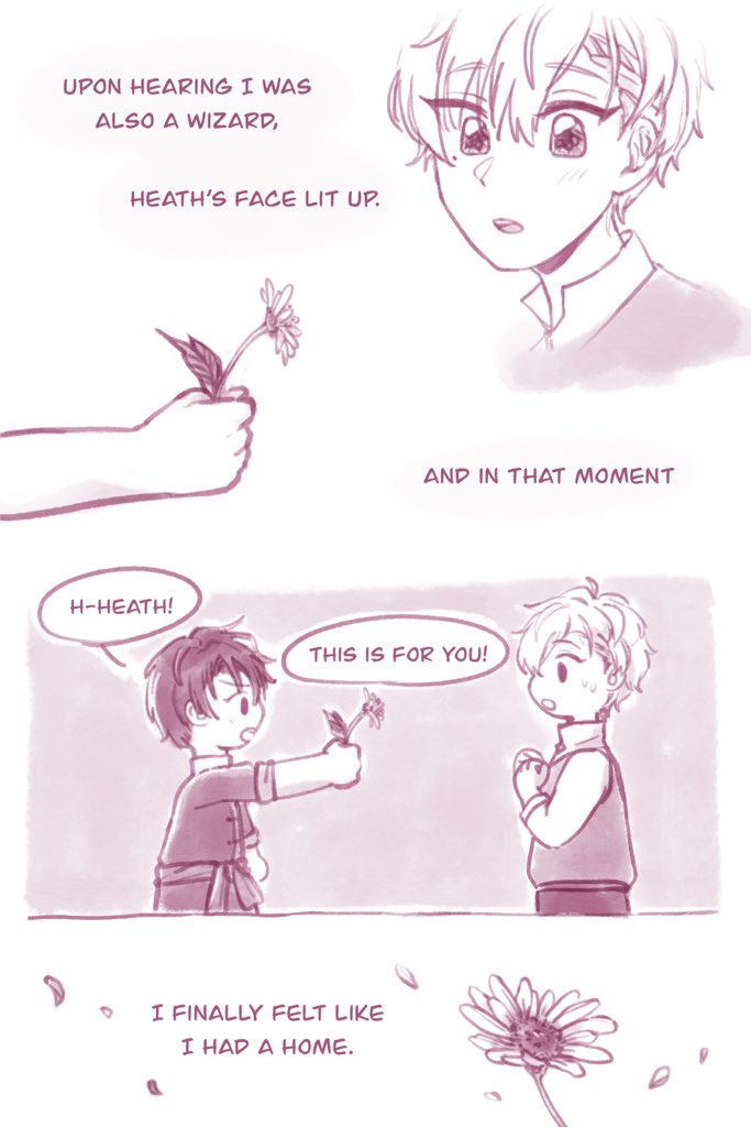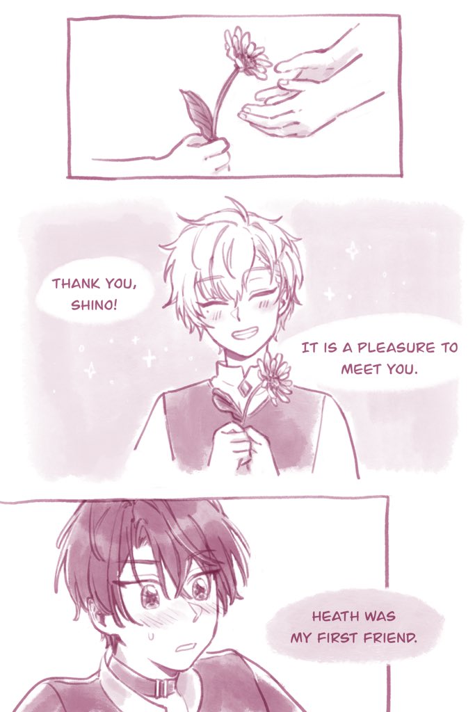 I drew this little Shino & Heath comic after reading main story chapter 12 last year!! Shino’s feelings are so earnest... he would give Heath the world if he could!! ! 😭💐 #まほやく_FA