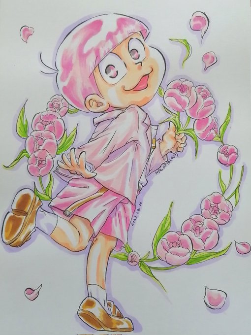 #春のペン松り #春のペン松り2023 チル松さんろくにんめ。ラストォー!✨ 末松たちは心置きなく、明るい可愛い系に全振りできるからやりやすいですね… TLお疲れ気味だから、少しでも元気の出そうな絵が描きたかった…🌹💗 twitter.com/HAL01706007/st…