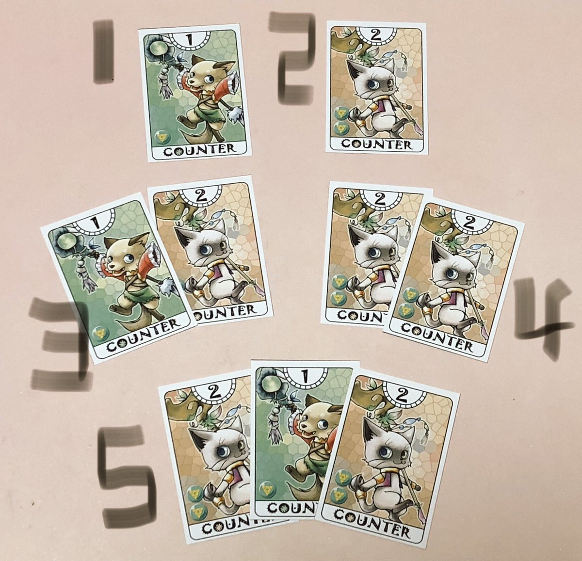 魔力カウンターの試作品 マジドッグ&キャット 表デザイン ドッグ(カウンター1) 裏デザイン キャット(カウンター2) カウンターが複数乗ってもなるべくかさばらないように考えてみました。