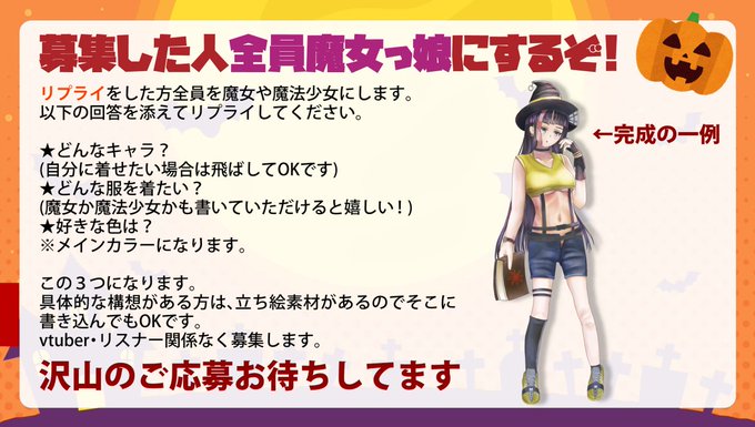 イラスト企画です!! リプライを送っていただいた皆さんを全員を魔女・魔法少女にしちゃいます🎁 期間は10月31日~11月10日23時59分まで 詳細は画像や動画で説明してます。 テンプレはご自由に! みんなの参加待ってまーす🥰 #Vtuberさんと繋がりたい #ハロウィンイラスト