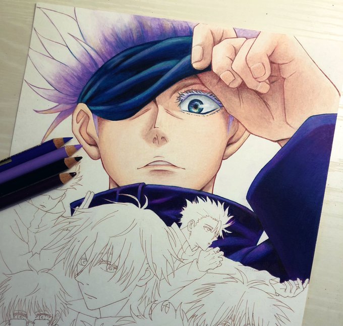 4 30 誕プレ制作! ようやく進められました 1人目完成 #五条悟 #イラスト #色鉛筆 #呪術廻戦 21/07/24 16:28