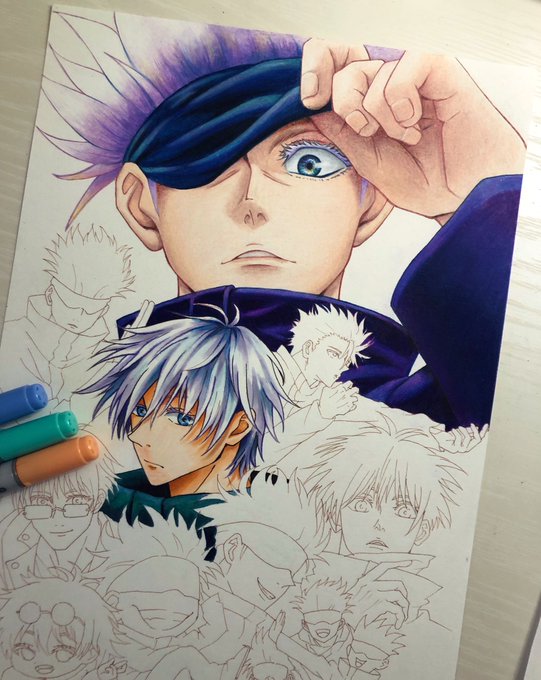 2 12 友達の誕生日プレゼント完成です! リクエスト:五条先生祭り かっこいい五条先生からミニキャラまでリクエストに答えられたと思います! #五条先生 #五条悟 #呪術廻戦 #色鉛筆 #コピック #イラスト #誕生日プレゼント 21/08/05 19:13