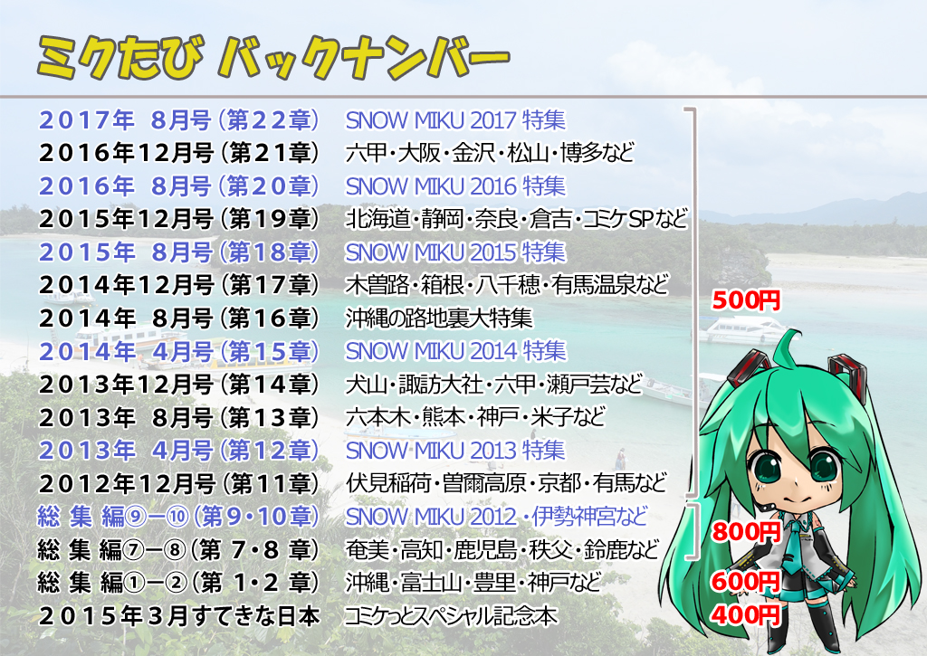 11 25 C100お品書きできた!ねんどろミクさんが旅する同人誌「ミクといっしょに旅しよう第29章」が新刊です。SNOWMIKU2022とか二風谷アイヌ文化博物館とか石垣島とか。バックナンバーもありますので気になられたら現地で試し読みをどうぞ。書店委託はできません。 #ねんどろいど #初音ミク #C100 #ミクたび 22/08/04 20:55