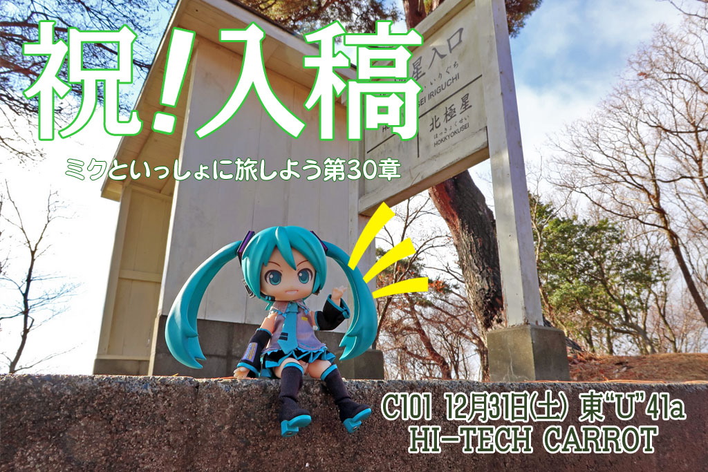 祝!冬コミ新刊入稿完了! 冬コミ土曜日(2日目)東U-41b HI-TECH CARROTにて、ねんどろミクさんのおでかけ紀行本「ミクたび 第30章」頒布します。詳細は来週には告知画像とか公開するのでよろしくお願いしますね!#ねんどろいど #ねんどろいどどーる #初音ミク #C101 #ミクたび