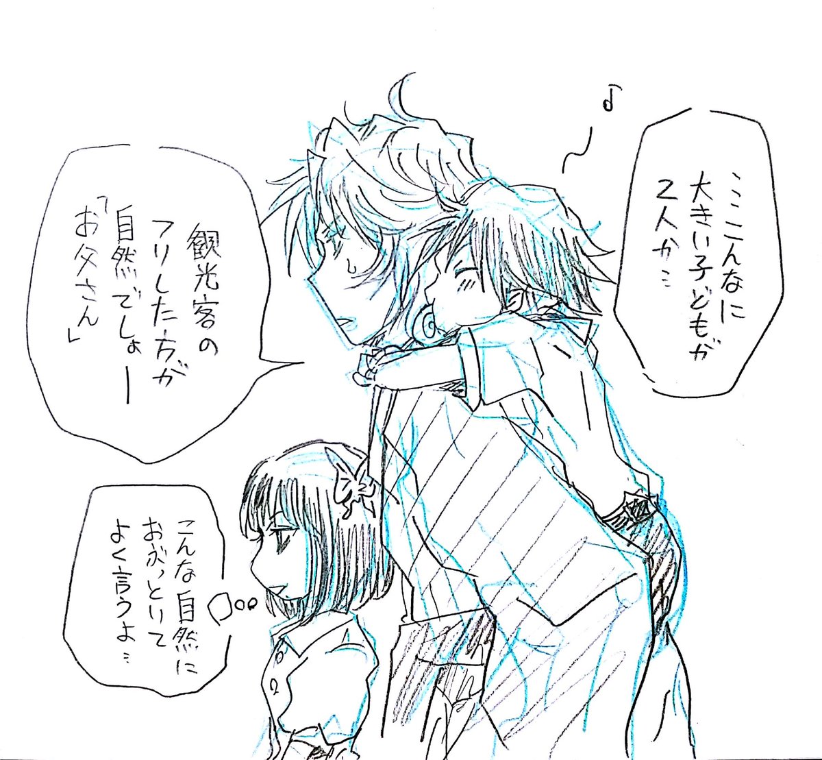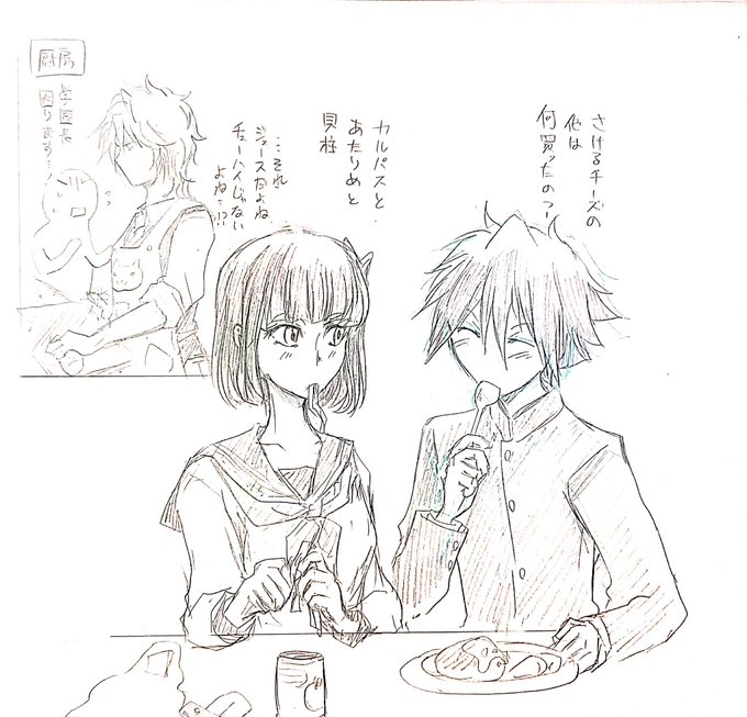 #このタグを見た人はラフ画とその完成絵を見せる これはけっこうラフから細かくいじった方かも(パースはもちろん表情の細かいところ特に)。 実際は色のついた紙に刷るので、もう少し見た目変わると思います。