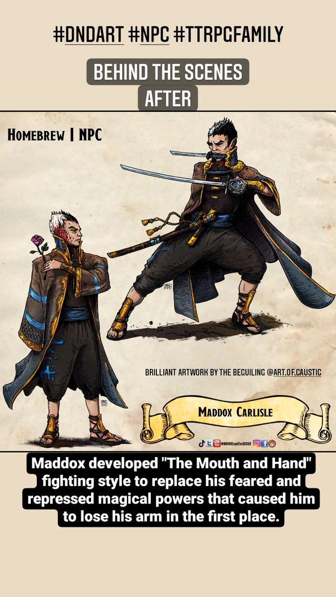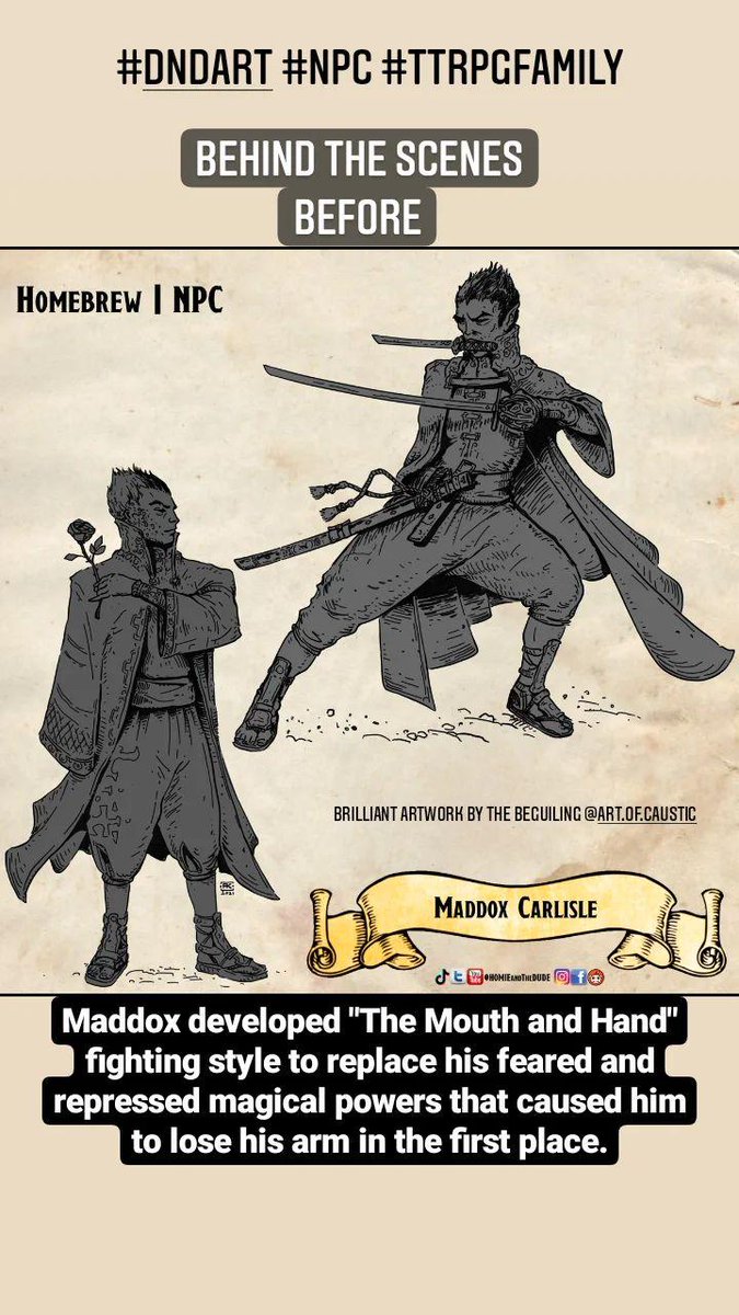 If you ever thought fighting a one armed man would be easy, just remember you've got more to lose... Here's a BTS for one of our NPCs drawn by the madlad: Art @OfCaustic! #dndart #DnD #ttrpgfamily