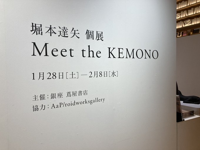 ●展示情報 銀座蔦屋書店様にて個展Meet the KEMONOを開催します。 会期は1/28(土)〜2/8(水)になります。 詳細はリンクをご確認ください。 ついにあのケモノさんを東京へ連れてきました。 直前のお知らせとなってしまい申し訳ありませんが、皆様のご来場お待ちしております! store.tsite.jp/ginza/blog/art…
