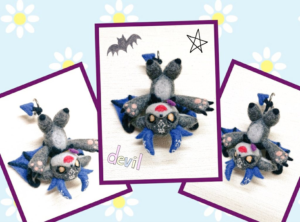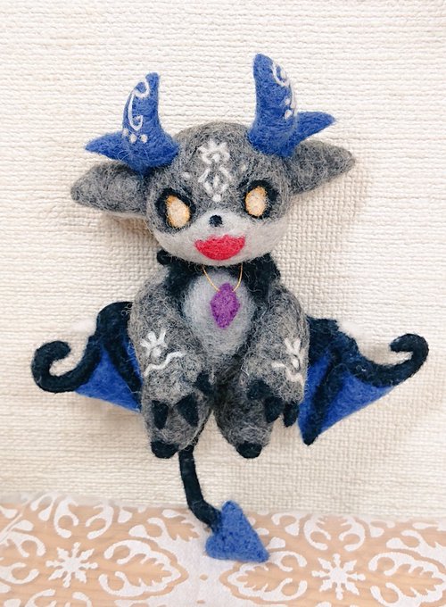 いだいなるあくま、でび様🚪👿 素材は羊毛ふぇるととあくせに糸、あと頭・両手・足・尻尾・羽に骨格モールをつかってるからある程度ポーズがとれるよ、やったね #でびるさまにささげるえ #にじさんじ手芸部