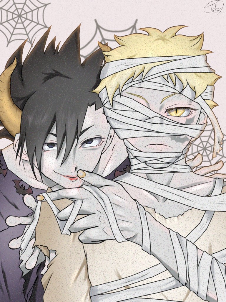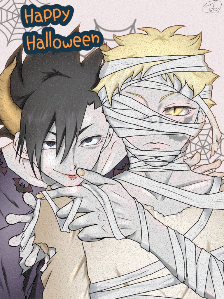4 26 はっぴーはろうぃーん🎃💕 てつろーとけいちゃん✨推しの顔面をほぼ隠すというwwww ツッキーのメガネはてつろーが美味しくいただきました! 今回は頑張ったよー!!! #ハロウィンイラスト #ハイキュー #黒尾鉄朗 #月島蛍 21/10/28 19:48