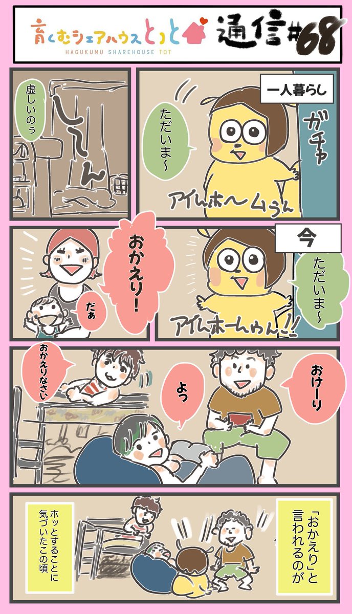 0 13 今住んでるシェアハウス「とっと」の日常漫画「とっと通信」#68🏠️♥️ 一人暮しとシェアハウスの「ただいま」の違い #とっと通信 #育むシェアハウス #シェアハウス漫画 #絵日記 #イラスト #HSP #コミックエッセイ #繊細さん 22/06/09 07:03