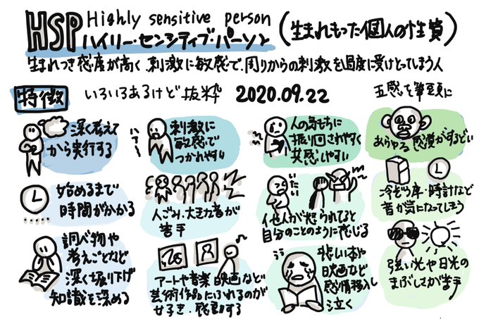1 2 HSP、ハイリー・センシティブ・パーソンについてグラレコ 。生まれつき感度が高く刺激に敏感で周りからの刺激を過度に受け取ってしまう人。 #グラフィックレコーディング #イラスト #落書き #hsp 22/08/12 06:54