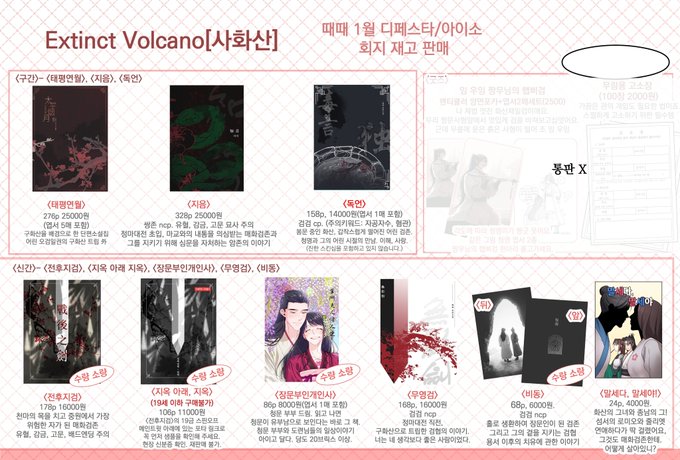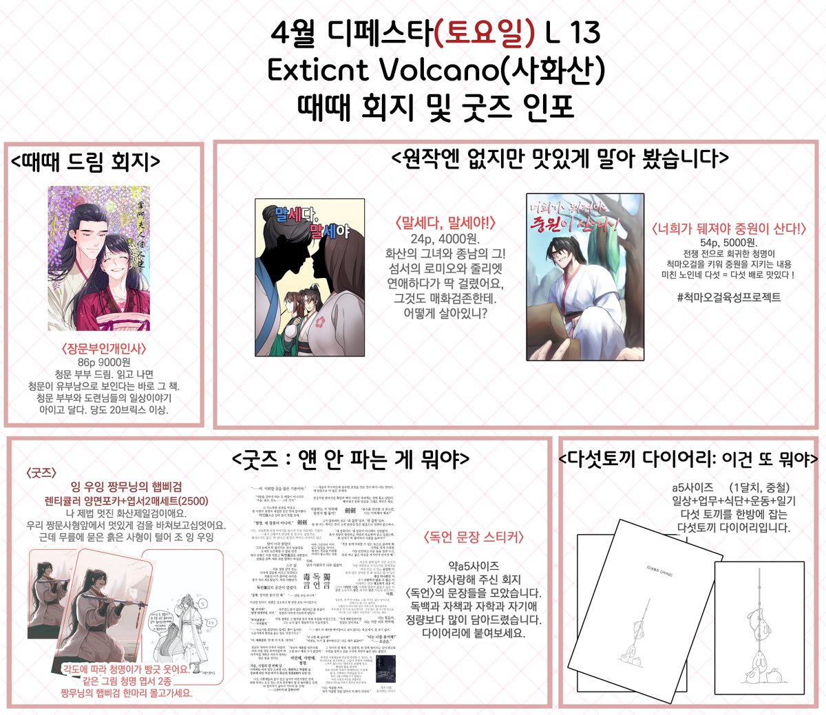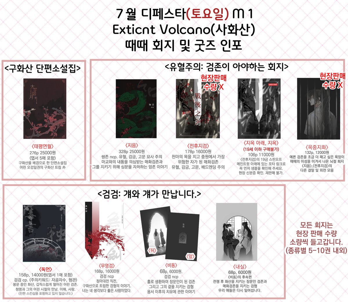 RT♥ 깊티 추첨 7디페(토) M1/우강정 우21 Extinct Volcano[사화산] 부스 인포 🌸신간 3종 <천하삼분> <너희 이거 기사멸조야!> <지옥 속에, 지옥> 포함, 회지 16종+굿즈 소량 🌸다섯토끼 다이어리(디페 수령) 🌸현장수령 선입금:witchform.com/deposit_form/4… 🌸통판 선입금:witchform.com/deposit_form/4…