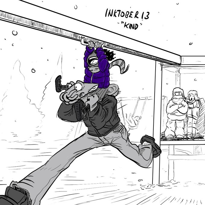 I was a teacher once, a lifetime ago it seems. One day, I ran an entire kindergarten class through one of these sliding rail rides during recess because a girl in a purple coat was looking at it all forlorn. By the time I turned, the line was off the playground. 😂 #Inktober2022