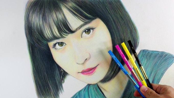 4色で描くフルカラーの横田ひかるさん完成しました。CMYKの4版を重ねて刷る印刷機を手で再現した色鉛筆画です。 色の不思議が見られて面白かったです。 メイキングはYouTubeにアップしました。 #4色色鉛筆 #CMYK #横田ひかる #るん #色鉛筆画 #coloredpencil横田ひかる