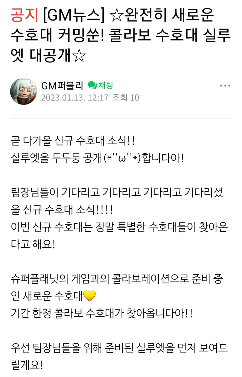 22 26 겜오수 신규 수호대 공지가 떴네용! 전오수에 나오는 캐릭은 아니고 겜회사내에서 콜라보해서 나오는 신규 캐릭이래요~! 실루엣 보니깐 슈플의 다른게임인 비공정 기사단 이라는 게임 내 캐릭터 같습니다🚀 23/01/13 12:36