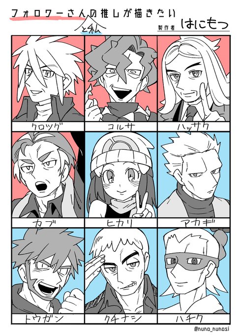 フォヨワの推しのやつ(赤背景) ポとポ以外に分けて空き枠に私のすきなこ(水色背景)をそれぞれ描きました。リプありがとうございました~