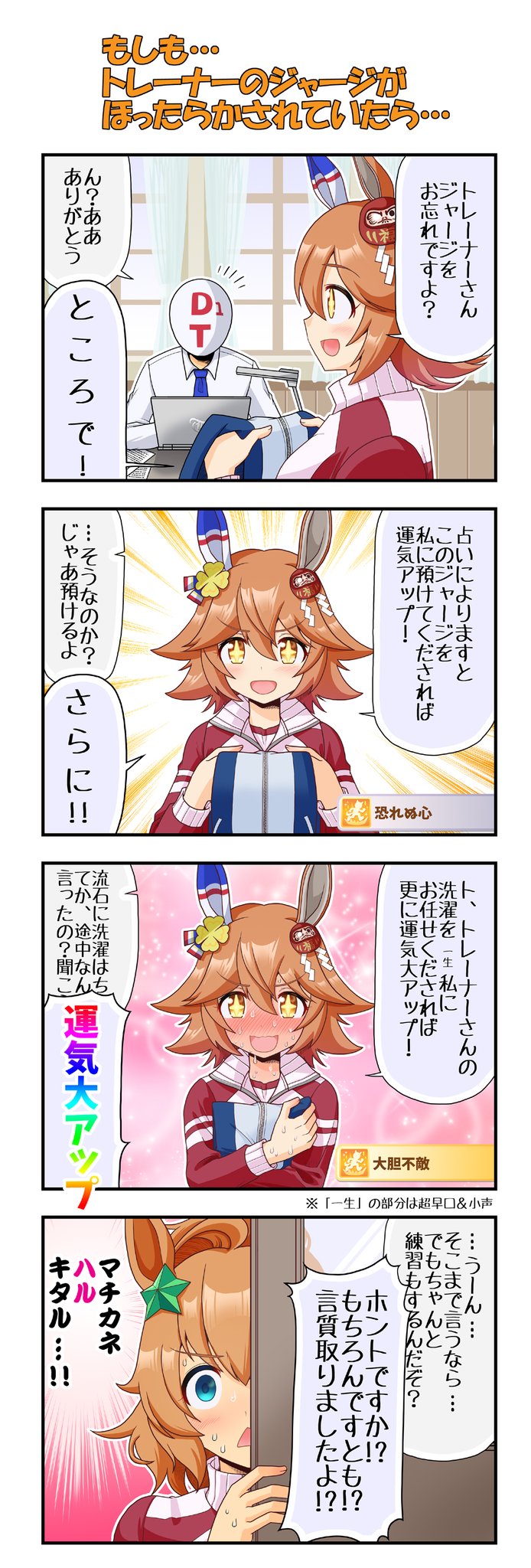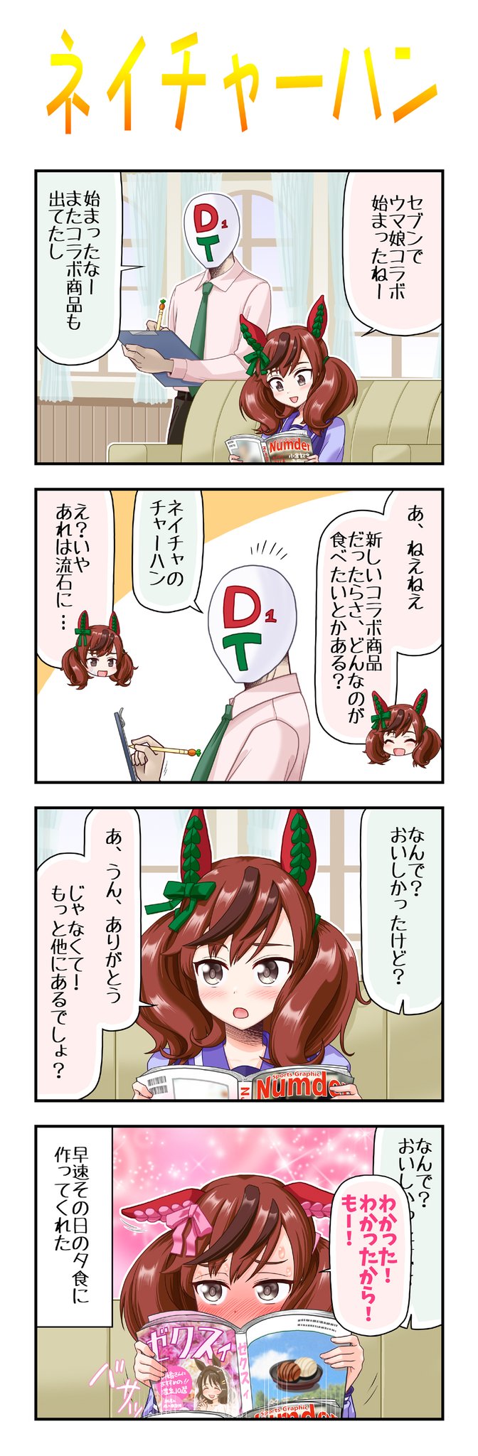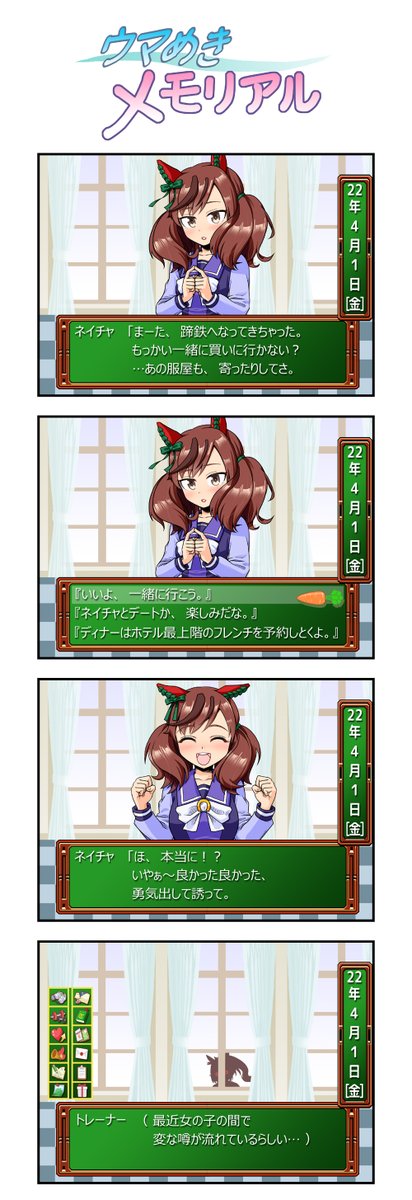 多分この手のネタはどなたが書かれているであろうとは思いますが…まぁ…見逃してくだされば クリスマスまでにあと1本の4コマ書くつもりですが、多分無理っぽいのす #ウマ娘プリティーダービー #ナイスネイチャ