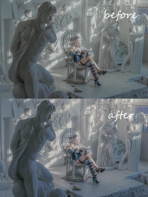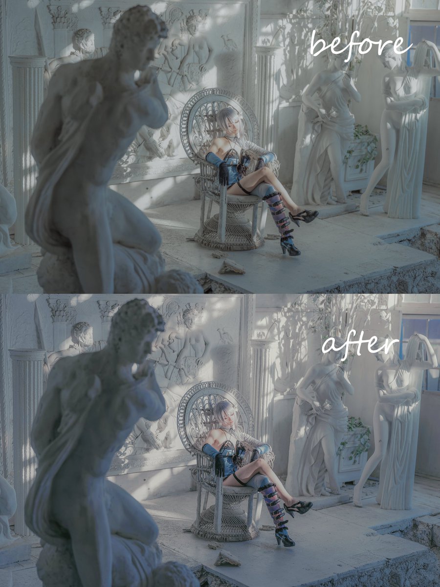 37 433 カイネ レタッチ before after 濁った光を綺麗な光にして神聖な空間感を強くしました。 その中で完全に黄み赤みを取り除いて青みや無彩色に振りきらず人物の体温や空間のぬくもりを残せるようにこだわりました。 23/07/21 11:16