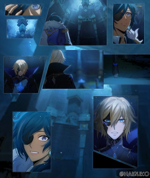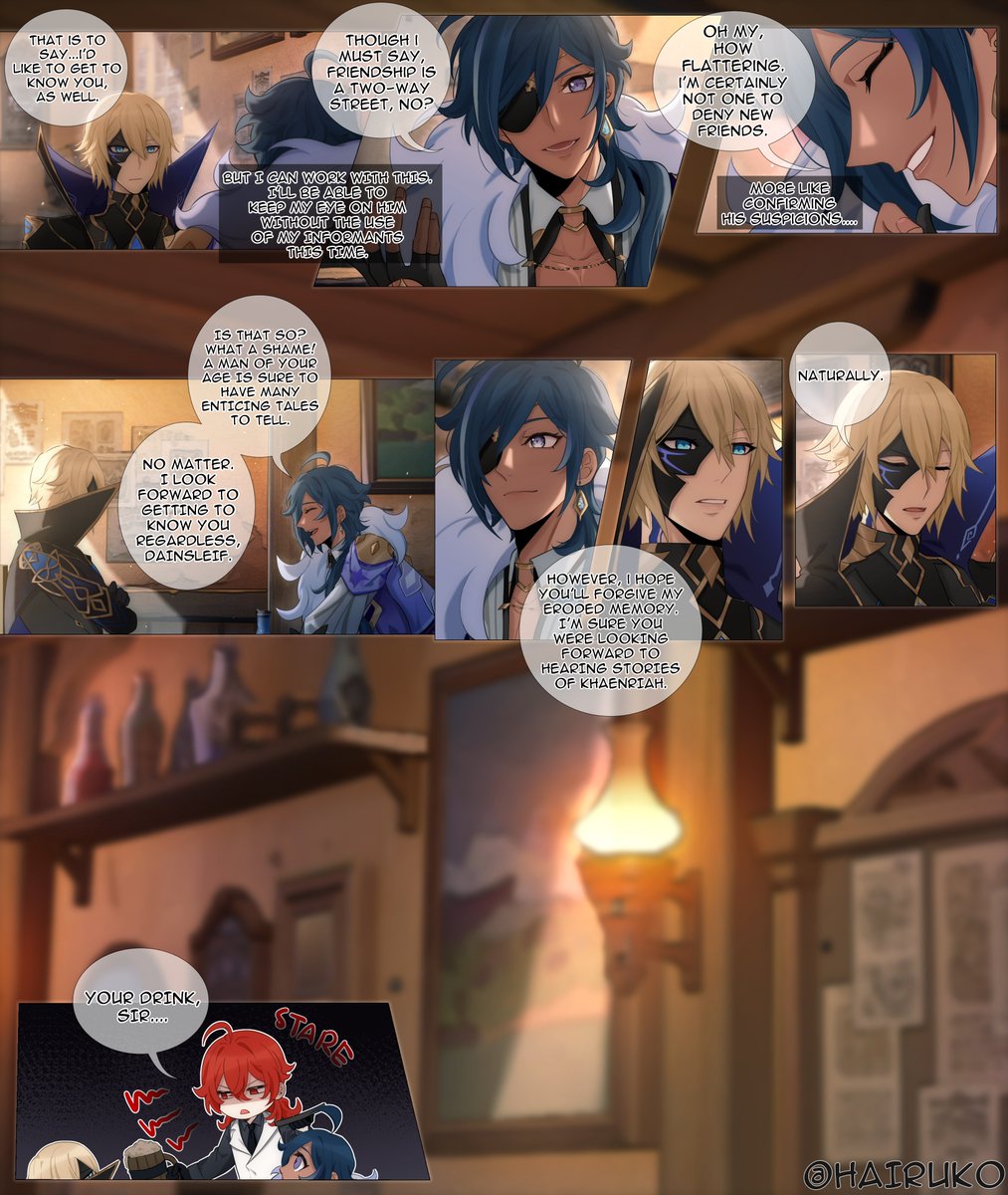 This is what I like to believe happened after 3.5 👀 Kaeya and Dainsleif finally get that drink and work out a friendship (not really) 😅 read from right to left! #GenshinImpact #Kaeya #dainsleif