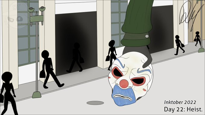 Inktober 2022 Day 22: Heist. "I believe whatever doesn't kill you simply makes you, Stranger." ~Joker. The Dark Knight. #inktober #inktober2022 #digitalart #digitalillustration #dccomics #dc #batman #thedarkknight #christophernolan #joker #bank #street #heist #clownmask