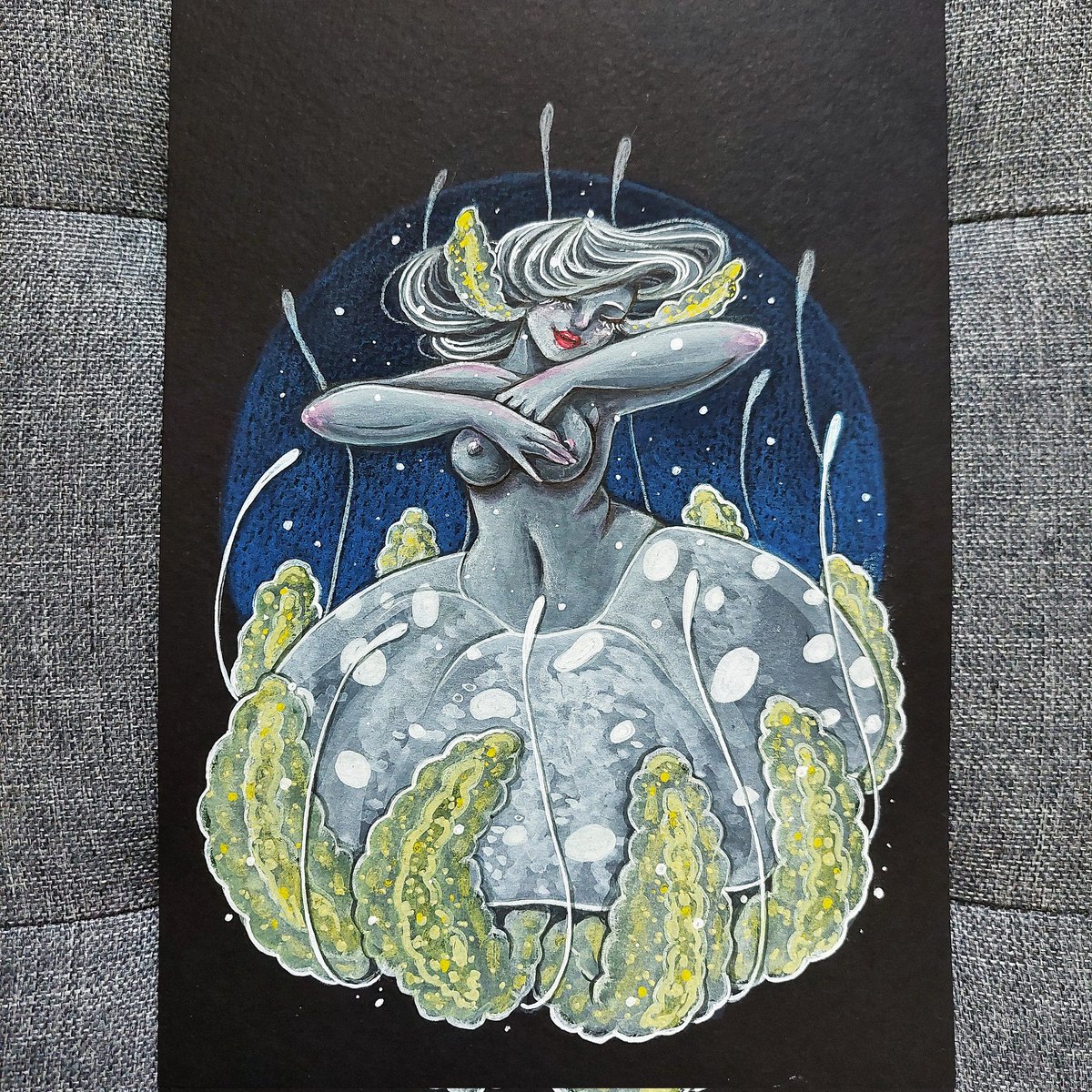#Mermay 2022 ♡ Day 16 White Spotted Jelly I am not using a prompt, just merming it up as i go ♡ Art done on A5 watercolour paper, this is a mixed media art piece using pencils, watercolour and markers. (CLAIMED) #mermaid #mermaidmay #mermay2022 #art #drawing #illustration
