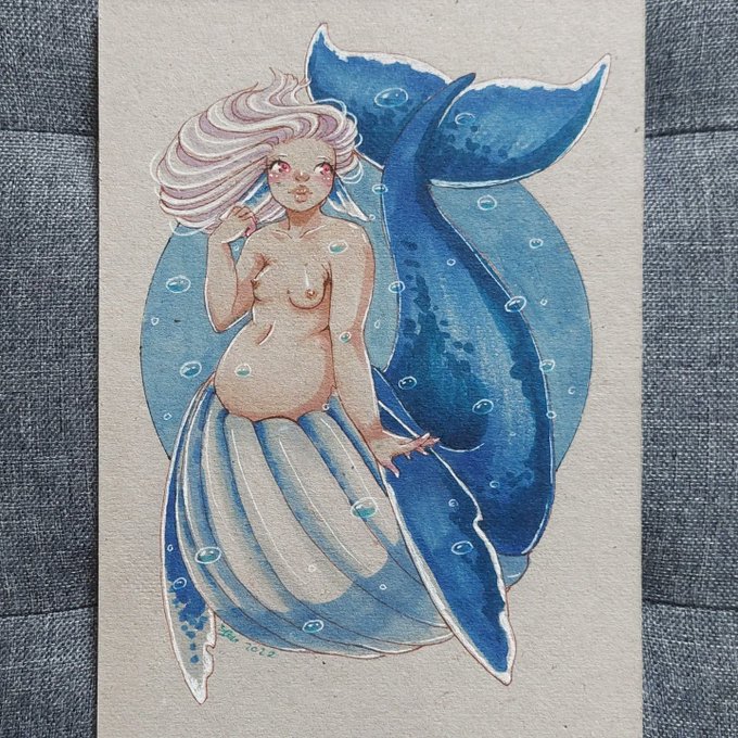 #Mermay 2022 ♡ Day 24 Blue Whale I am not using a prompt, just merming it up as i go ♡ Art done on A5 watercolour paper, this is a mixed media art piece using pencils, watercolour and markers. #mermaid #mermaidmay #mermay2022 #art #drawing #illustration