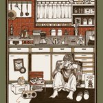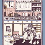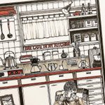 「 The CAFE in my kitchen 」 色の組み合わせやphotoshopの効果の勉強に使いたくて、久々に描いたお部屋(キッチン)の絵。 原画の一部とレトロカラーver. #イラスト #線画イラスト #illustration