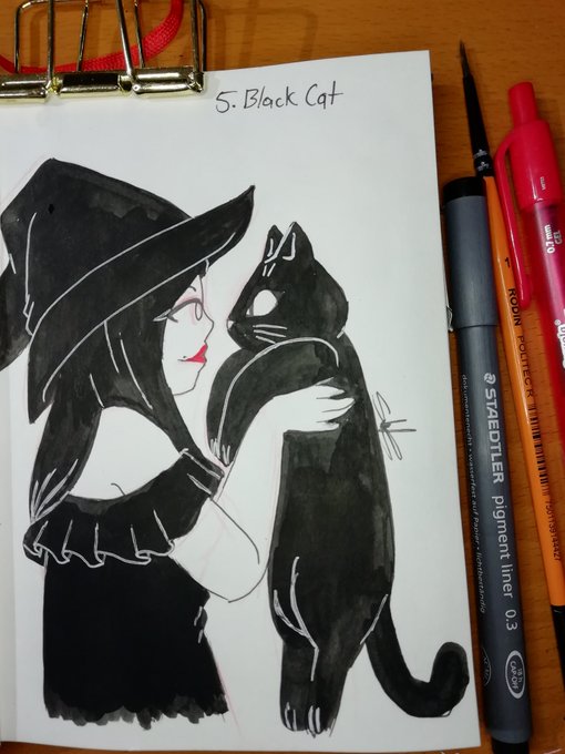 Day 5// Black Cat 🐱🖤 . @JanethJoestar la bruja de los gatos nunca sola esta, pues su fiel gato negro detrás de ella siempre va . #inktober2021 #Inktober #witchtober2021 #Day5