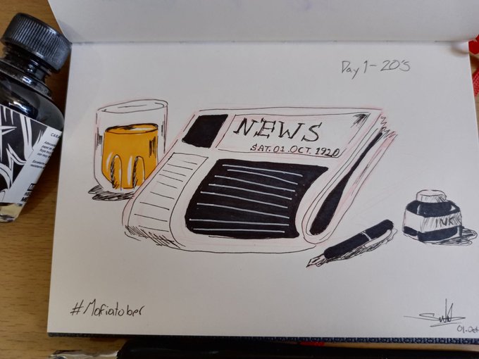 Día 1- 20's Despiertas una mañana en los años 20's y que mejor que empezar leyendo el periódico con un buen trago #Mafiatobet #inktober #inktober2022