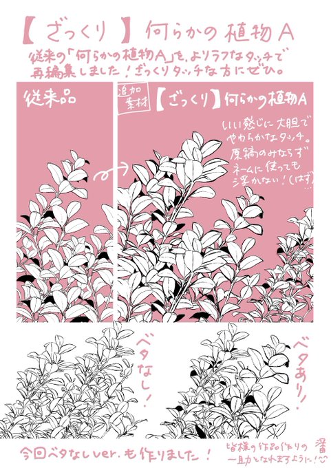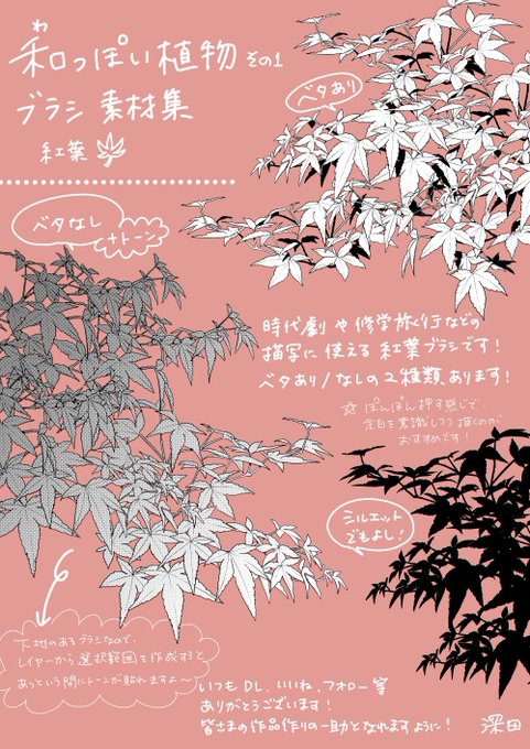 クリスタアセットにて新作素材「和っぽい植物その1・その2」を公開しております!その1「紅葉」はブラシ素材(10CP)、その2「松」は画像素材(無償)になります。 既存素材の2021年夏版もまとめてみましたので、良ければチェックしてみてください〜!😊🙏✨ assets.clip-studio.com/ja-jp/detail?i… #clipstudio