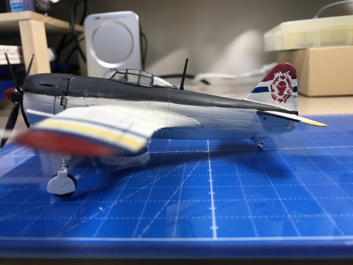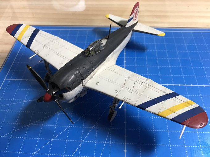 4 11 紫電(カナリア自警団・アコ機)完成。使用キットはタミヤ72。カナリアの隊印は無理と断念。最後まで丁寧さを維持できなかったけど作り上げれたから良し #コトブキ模型隊 19/02/23 22:47